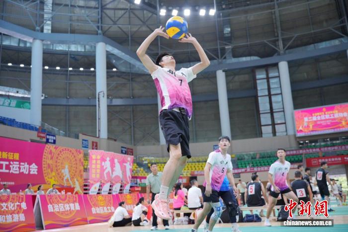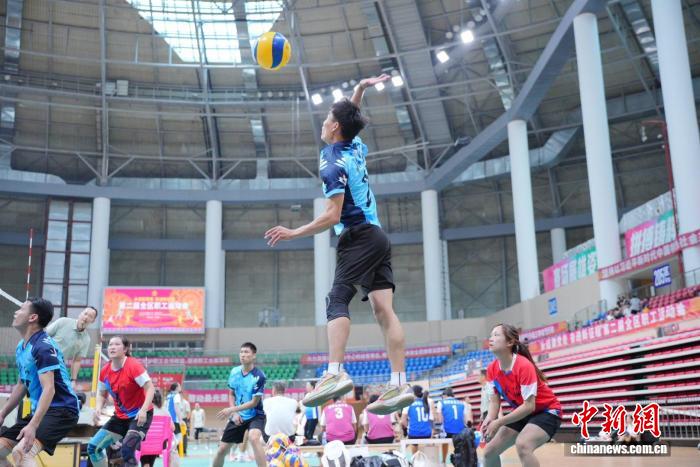 图为行动员正在气呼呼排球角逐中的扣宰刹时。广西总工会 供图