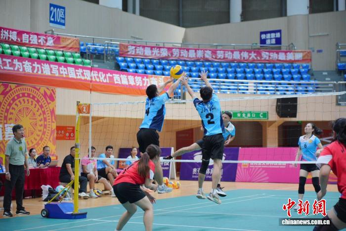 图为活动员正在气呼呼排球角逐中拦网。广西总工会 供图