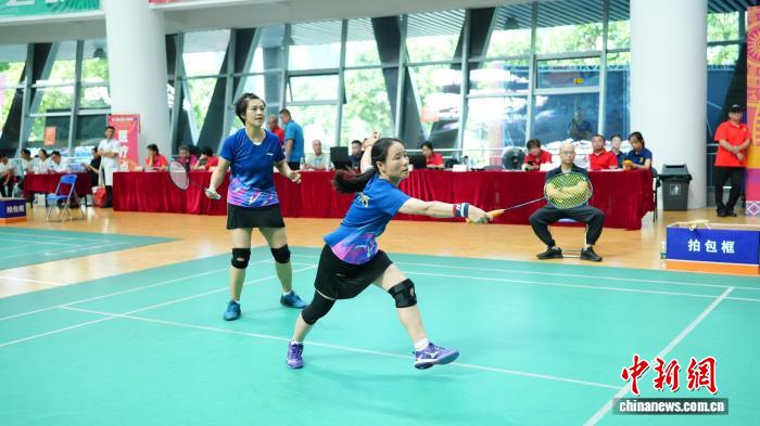 图为行动员正在羽毛球角逐中收球。广西总工会 供图