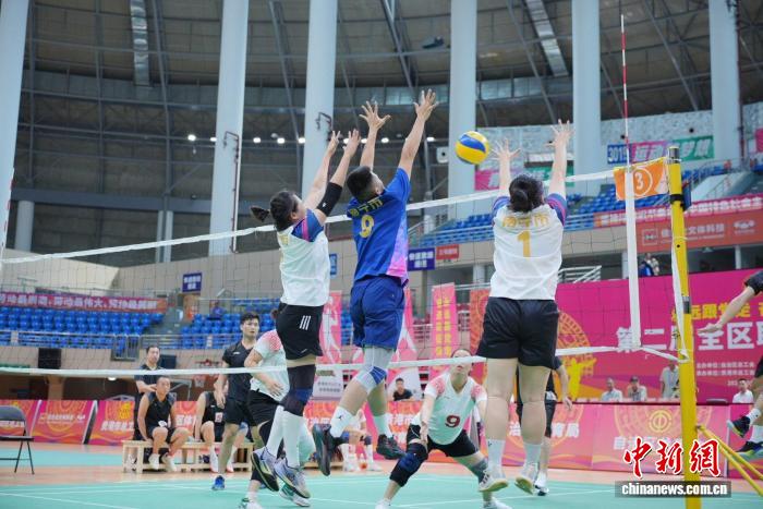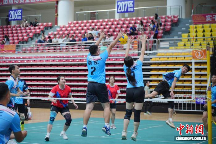 图为疏通员正在气呼呼排球角逐中拦网。广西总工会 供图